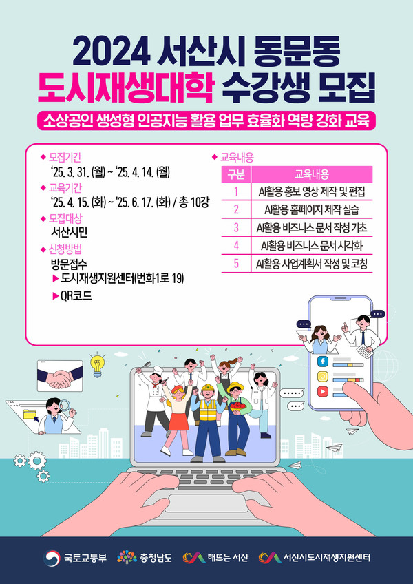 이번 교육은 디지털 기술을 접목한 도시재생 사업을 통해 지역 경제 활성화를 도모하고자 한다. 교육을 희망하는 서산시민들의 많은 관심과 적극적인 참여가 기대된다.